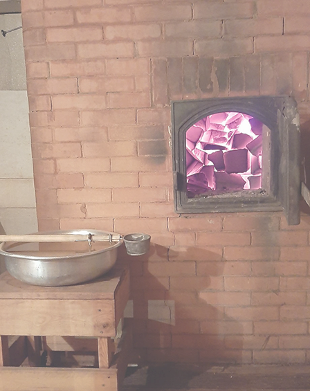 Каменка заложена габбро-диабазом крупной колки, который специально заказывается на месторождениях Карелии. Хорошо нагретые огнем камни горят изнутри малиновым светом с утра до позднего вечера, несмотря на то, что за день в бане может попариться человек 100.